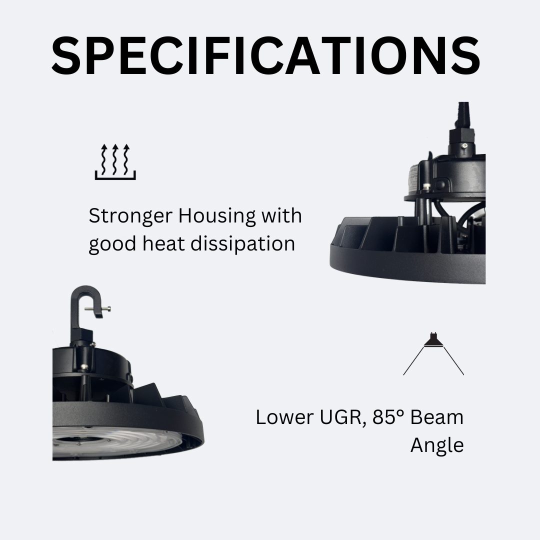 High-bay lights are used to illuminate spaces with high ceilings. That usually means ceilings ranging from 20 feet to approximately 45 feet. Low-bay lights, on the other hand, are used for ceilings 20 feet and under. Because a high-ceiling location has more space to fill, a high-bay, by definition, is a powerful light source that can brighten up a large area. The term UFO comes from the round shape of this style of high bay light.